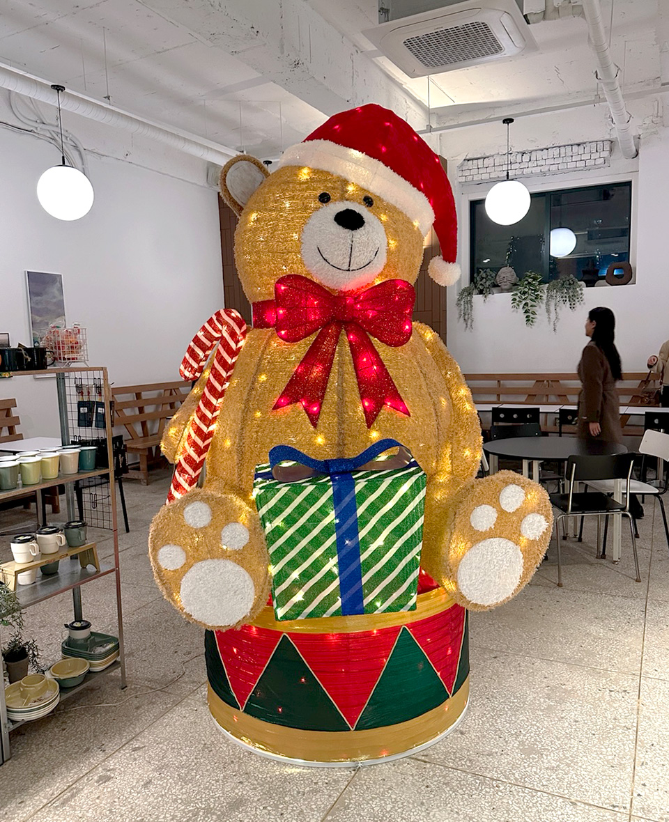 카페 중앙에 위치한 곰돌이 크리스마스 조형물이 정말 귀여웠습니다. 🎄🐻